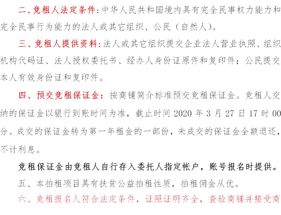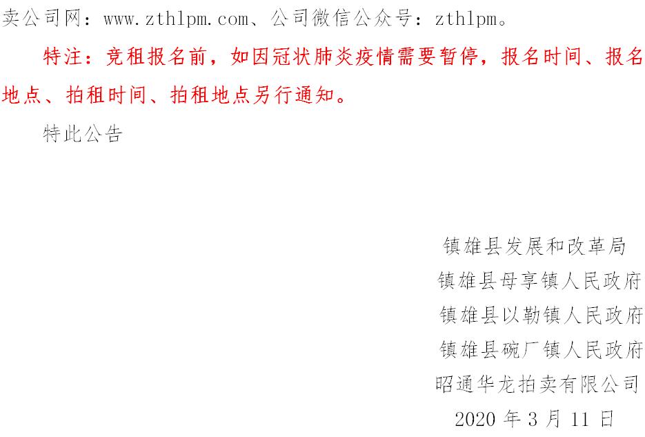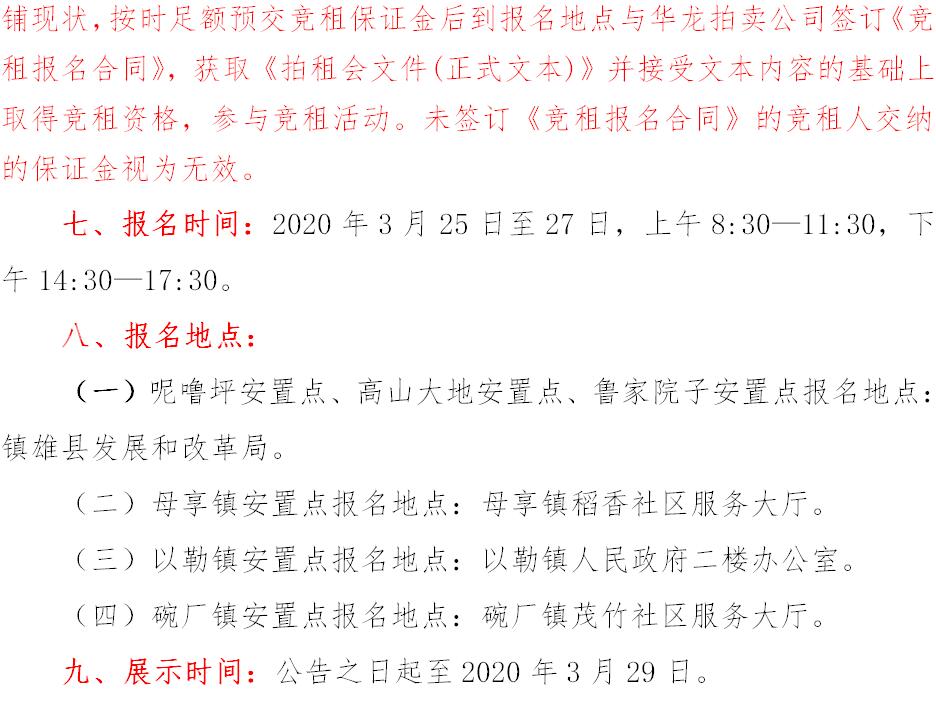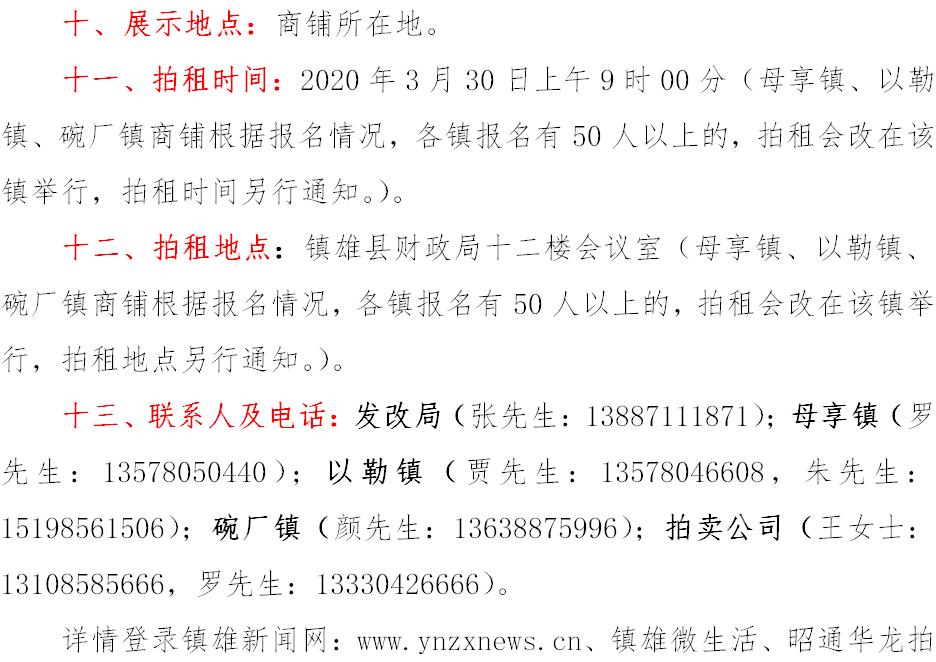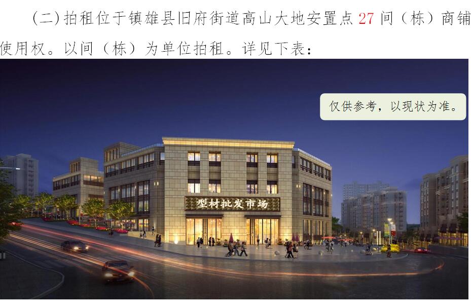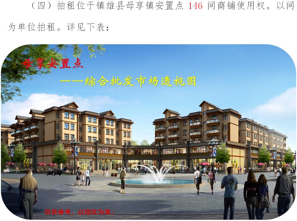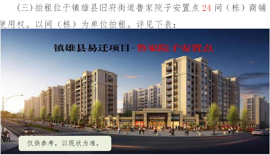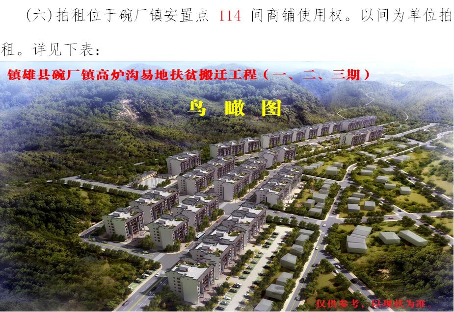 經(jīng)鎮(zhèn)雄縣人民政府批準,受相關(guān)部門(政府)委托,公開拍租位于鎮(zhèn)雄縣易地扶貧搬遷工程呢嚕坪安置點7棟獨立商鋪使用權(quán)、高山大地安置點27間(棟)商鋪使用權(quán)、魯家院子安置點24間(棟)商鋪使用權(quán)、母享安置點146間商鋪使用權(quán)、以勒物流城安置點67間(棟)商鋪使用權(quán)、碗廠安置點114間商鋪使用權(quán)。相關(guān)事項如下: